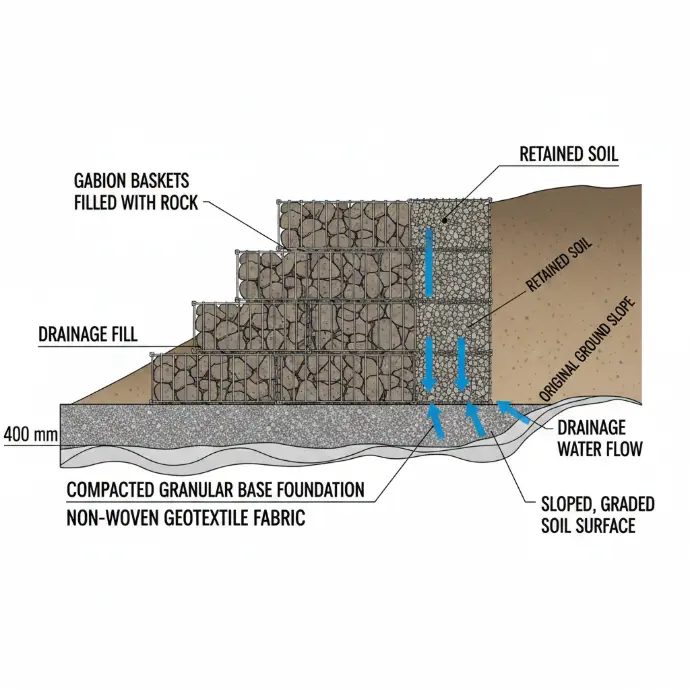 Gabion Retaining walls are usually built on a slope prepared from graded soil, using a layer of non-woven fabric beneath. The extra layer helps strengthen the base, lowers settlement and makes draining water simpler. A deeper 400 mm base for the wall is suggested to help secure it even more.